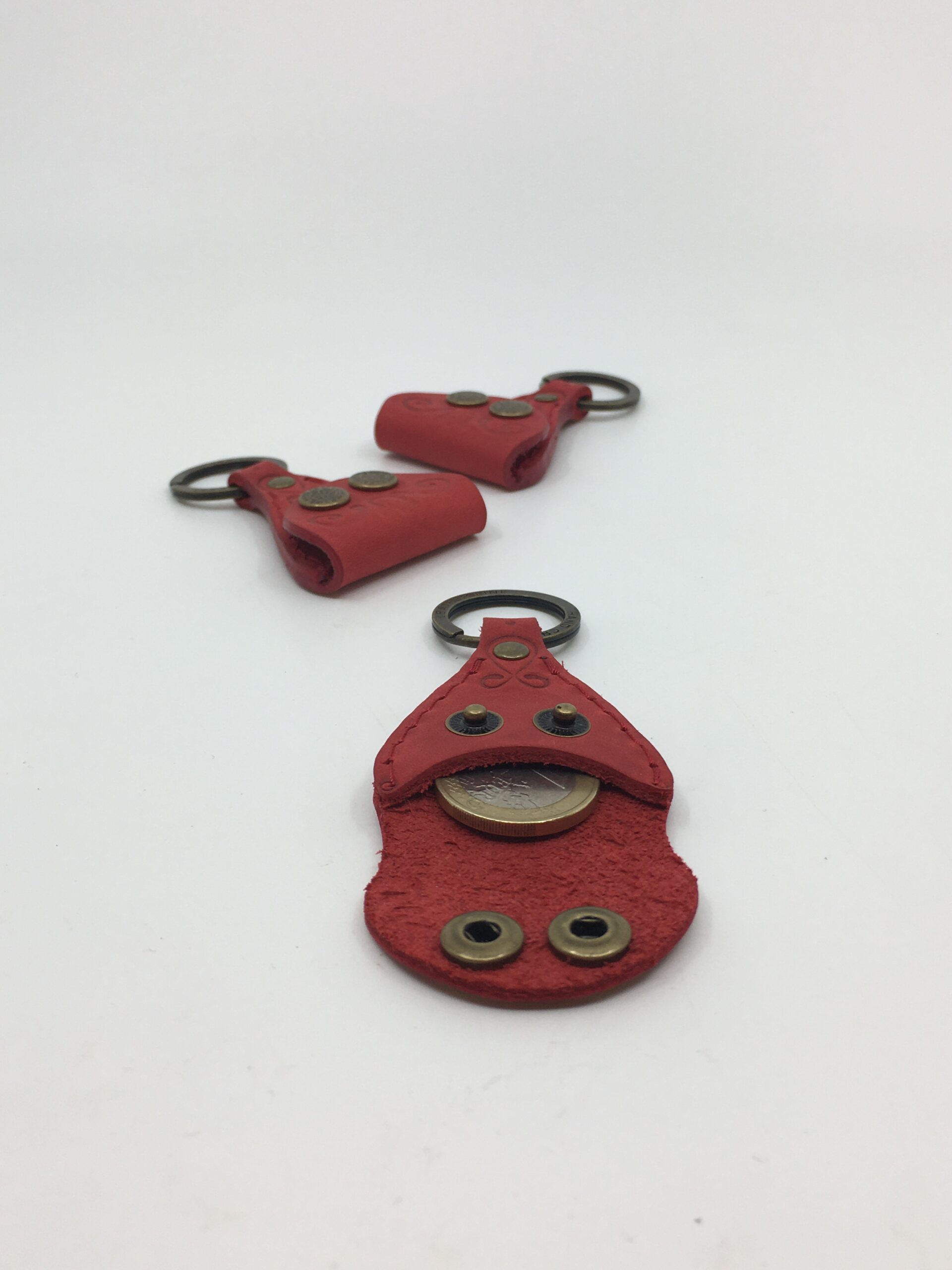 Raudonos odos raktų pakabukas su užsegama kišenėle bet kurios šalies pinigėliui